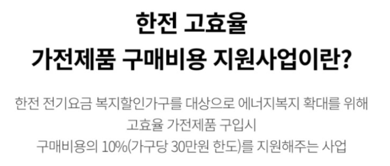 한전 전기요금 복지할인가구를 대상으로 에너지복지 확대를 위해 고효율 가전제품 구매시 구매비용의 10% (가구당 최대 30만원 한도)를 지원해주는 사업으로 2022년에도 계속 시행된다고 합니다.