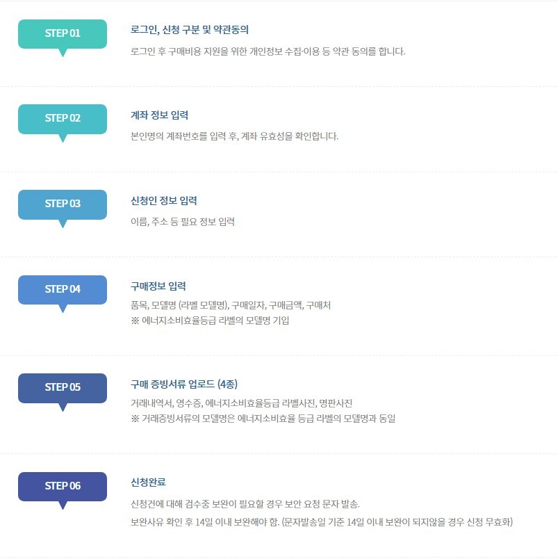 한국전력공사 홈페이지 회원가입 후 로그인 > 사업신청 클릭 > 계좌정보 입력 > 신청인 정보 입력 > 구매정보 입력 > 구매 증빙서류 업로드까지 하시면 됩니다.
