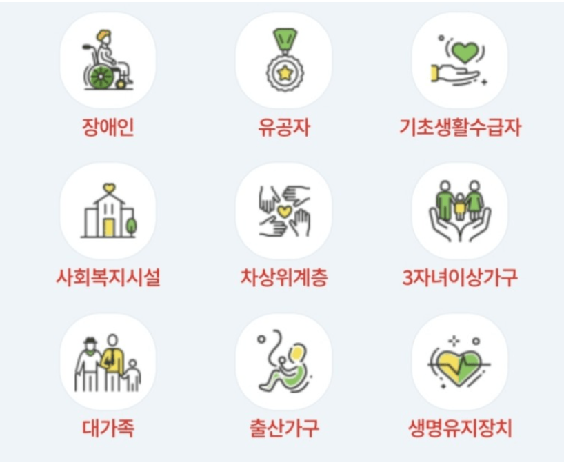 - 유공자: 국가유공자 1~3등급, 상아유공자 1~3등급, 독립유공자