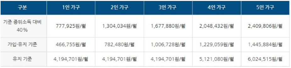 나이 상관없이 가구 소득인정액이 40% 이하인 가구 중 일하는 사람이 있어야 신청이 가능합니다. 신청당시 소득인정액이 아래 금액 이상이 되어야만 신청이 가능합니다.