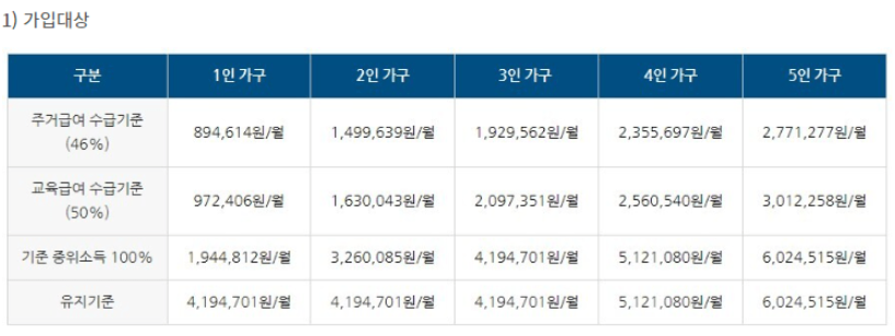 주거(기준 중위소득 대비 46%) , 교육 (기준 중위소득 대비 50%) 급여 수급가구 또는 근로·사업소득 상한성이 기준중위소득 대비 100% 이하인 차상위계층 가구일 경우 신청이 가능합니다.