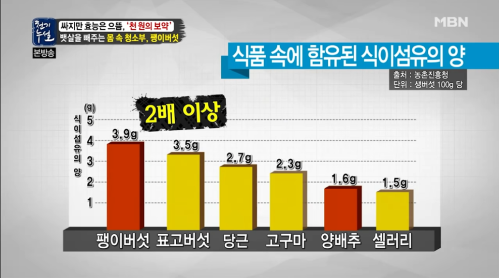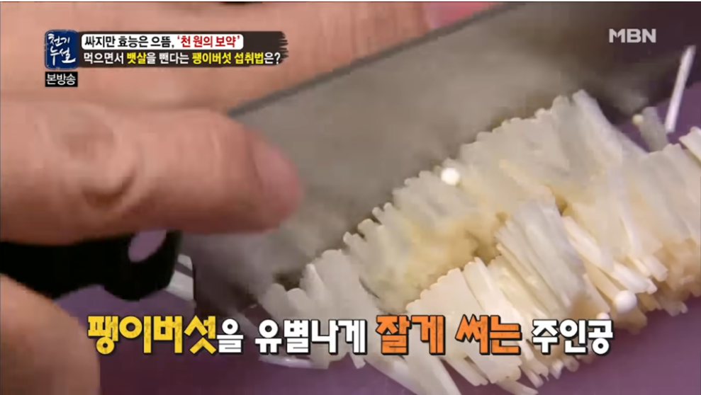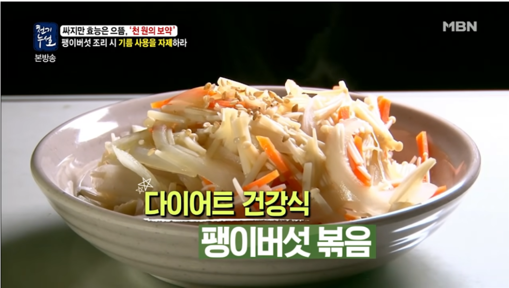 mbc '천기누설' 191회 '천원의 보약' 단돈 천원짜리 식재료로 100일 동안 무려 -16kg를 감량해 다이어트의 놀라운 효능을 자랑하는 팽이버섯이 소개되었습니다. 마트가면 흔히 볼수있고 저렴한 가격에 구입할 수 있습니다.