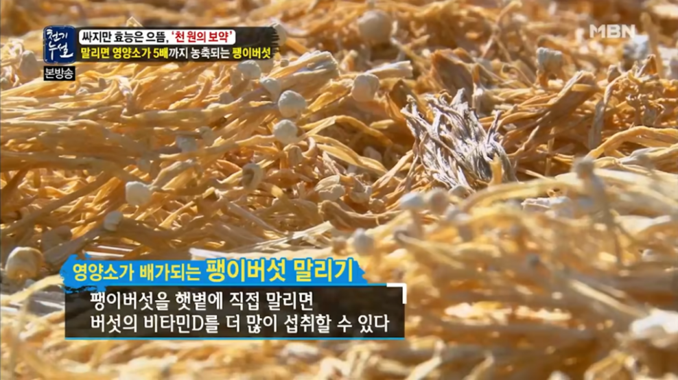 말린 버섯은 수분이 빠지면서 영양소가 2배에서 5배까지 농축이 되는데 말린 팽이버섯을 간식처럼 드시거나 차에 우려 마시면 체지방을 분해시키고 비타민D, 유용한 영양 성분들을 더욱 효과적으로 섭취하실 수 있습니다.