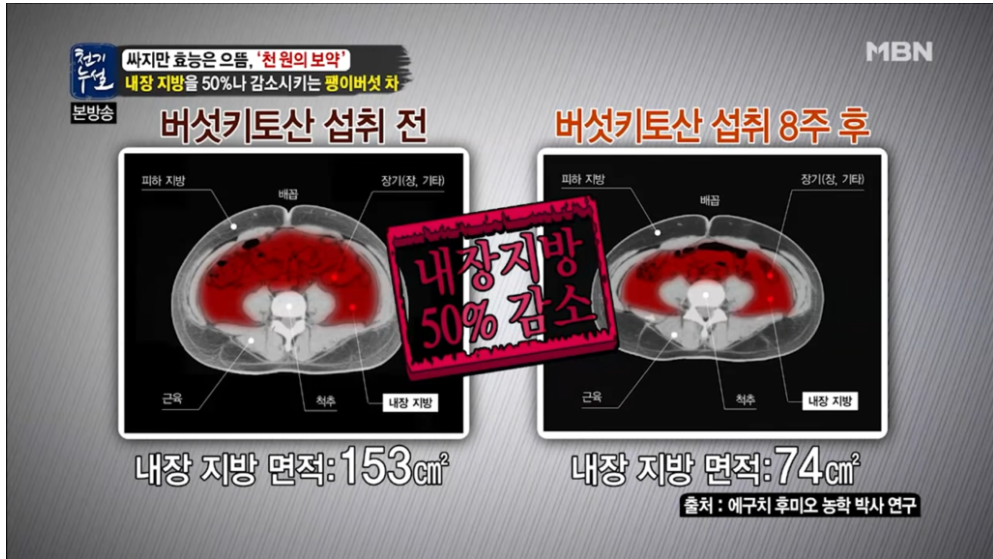 실제로 일본 동경 농업 대학교 실험한 결과, 버섯 키토산을 8주동안 섭취한 결과, 허리둘레가 줄어들고 내장 지방이 50%나 감소했다고 합니다.