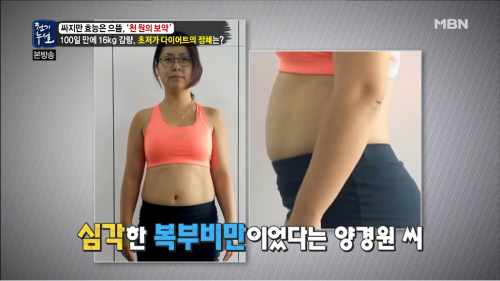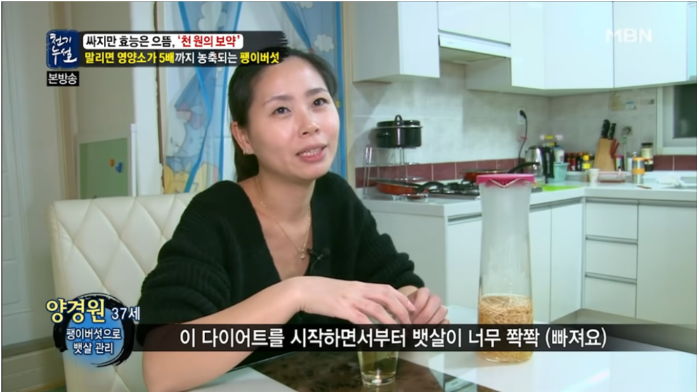 이분은 팽이버섯을 차처럼 마시기 시작하면서 뱃살이 쫙쫙~ 빠졌다고 하는데요. 한달안에 눈에 띌 정도로 배가 많이 들어갔다고 합니다.