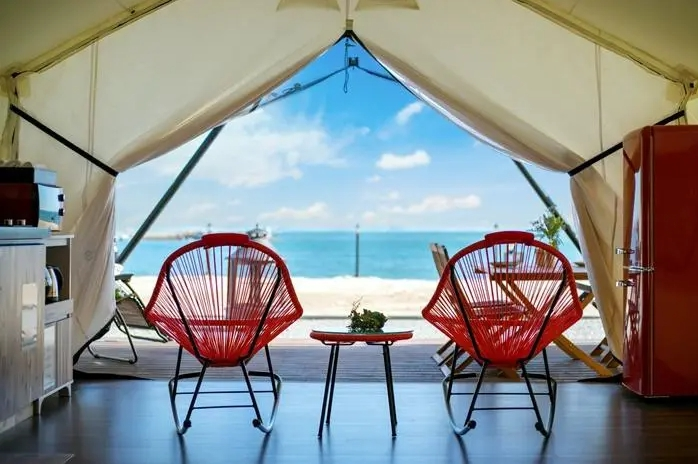 겉으로 보기엔 텐트처럼 보이지만 내부는 펜션처럼 편리하게 꾸며져 있습니다. 텐트마다 개별 야외 데크도 갖추고 있어서 저녁에는 모닥불을 피워놓고 바베큐를 즐기기 좋습니다.