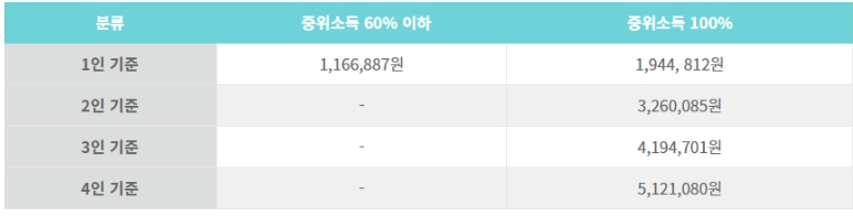 - 중위소득 60% 이하, 전체 가구 소득이 기준 중위소득 100% 이하