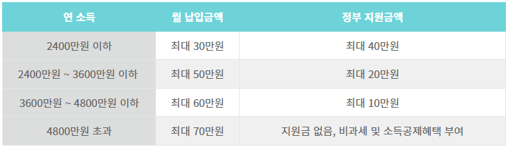 다만 연소득이 4800만원 초과할 경우는 지원금에 대한 지원은 없으며 비과세 및 소득공제의 혜택을 제공받을수 있습니다. 또한, 가입기간 중 소득이 상승했을 경우 혜택도 달라집니다.