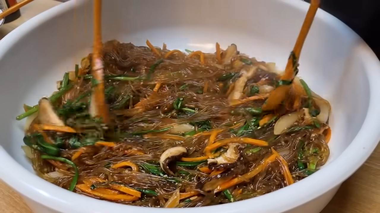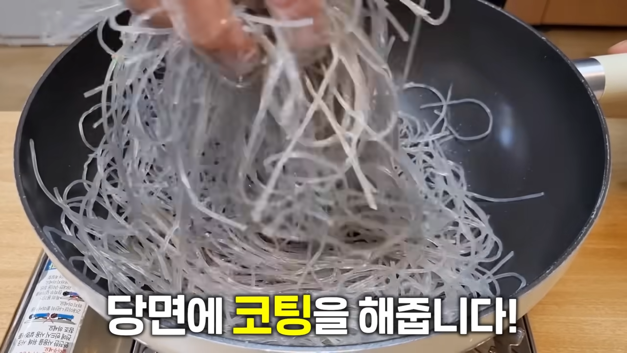 📌 비닐 장갑을 끼고 당면에 식용유를 버물려 코팅해주세요 이런 과정을 거쳐야 잡채가 팅팅 불어나는 것을 예방할 수 있습니다.