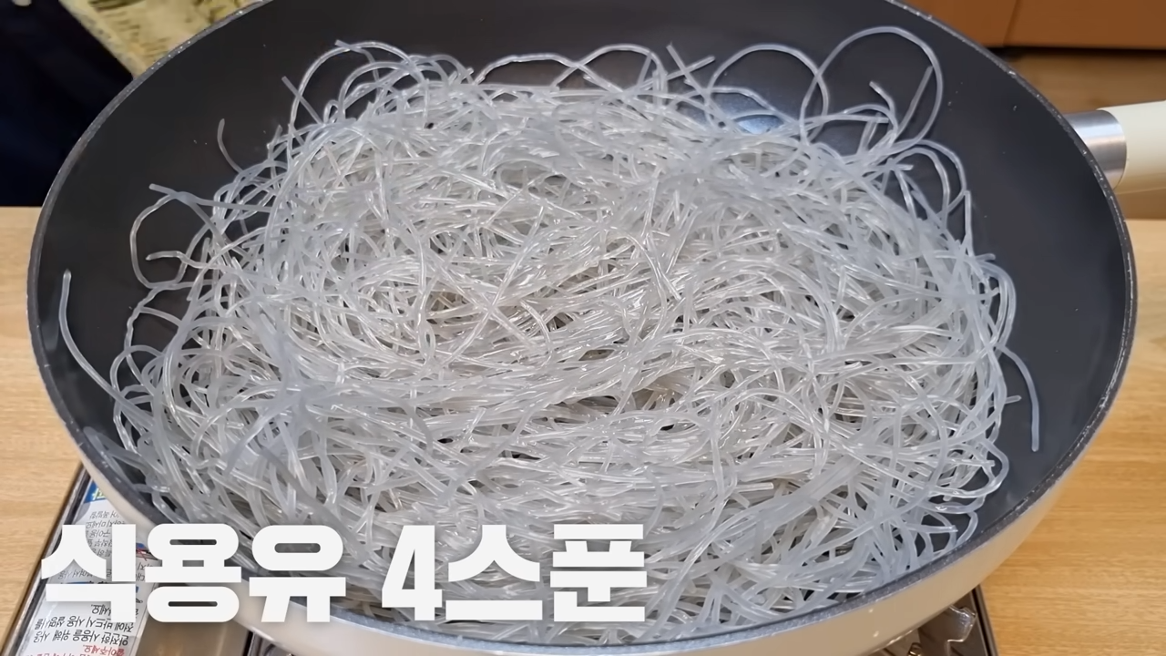 📌불린 당면을 후라이팬에 불이 켜지지 않은 상태에서 당면에 식용유 4스푼을 넣어주세요.