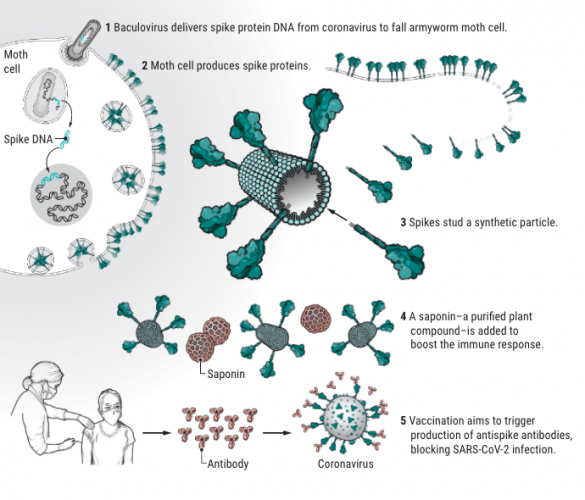 노바백스는 기존에 나온 백신들과는 다른 형식인데요. 백신의 원리는 유전자 곤충에 감염되는 바이러스에 먼저 끼워 넣은 후 바이러스가 곤충에게 감염되면 그 안에서 스파이크 단백질을 대량 합성하고 그 합성한 단백질을 정제한 뒤 면역증강제 역할을 할 사포닌을 추가해 백신으로 만드는 방식입니다.